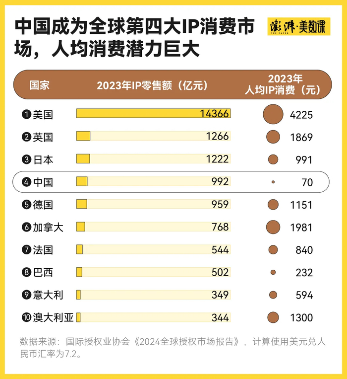 国际授权业协会数据显示,中国在 2023 年超越德国成为全球第四大 IP 零售市场,全年 IP 零售额接近 1000 亿元。但从人均 IP 消费来看,中国只有排名第一的美国的人均IP消费的六十分之一,也远低于IP消费市场总量排在前十的其他国家。中国个人 IP 消费还有很大的增长空间。
