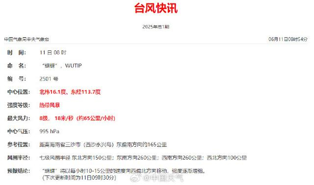 今年第1号台风“蝴蝶”(热带风暴级;英文名称:Wutip;名字来源:中国澳门;名称意义:一种昆虫)于6月11日8点钟在南海中西部海面生成,其中心位于海南省三沙市(西沙永兴岛)东南方向约165公里的海面上,就是北纬16.1度、东经113.7度, 8级(18米/秒),995百帕,7级风圈半径为100-260公里。预计,“蝴蝶”将以每小时10-15公里的速度向西偏北方向移动,强度缓慢加强,逐渐向海南岛南部沿海靠近,并于13日凌晨到上午在上述沿海登陆(强热带风暴级到台风级,10-12级,25-33米/秒),之后有可能于13日夜间在广东西部到广西沿海再次登陆(热带风暴级到强热带风暴级,8-10级,20-25米/秒),登陆后转向东北方向移动,强度逐渐减弱。