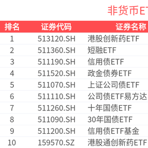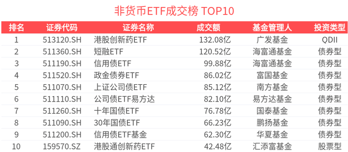 截至今日收盘,港股创新药ETF、短融ETF、信用债ETF成交额居市场前列,分别达132.08亿、120.52亿、99.88亿。行业主题类ETF共计2只,分别是港股创新药ETF、港股通创新药ETF。