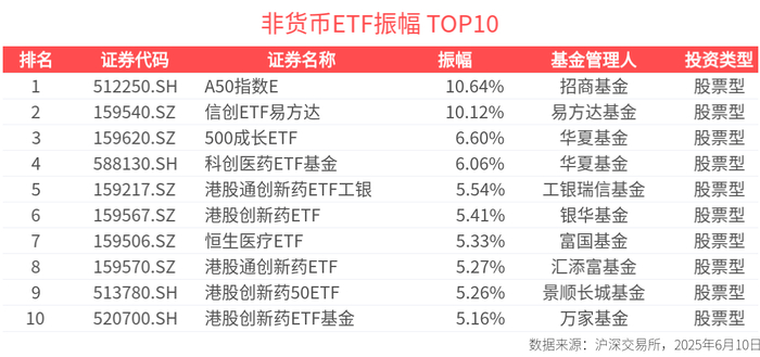 截至今日收盘,A50指数E、信创ETF易方达、500成长ETF振幅居市场前列,分别达10.64%、10.12%、6.60%。