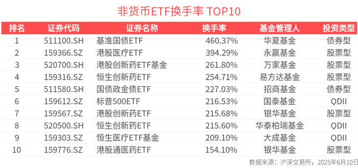 截至今日收盘,基准国债ETF、港股医疗ETF、港股创新药ETF基金换手率居市场前列,分别达460.37%、394.29%、261.80%。宽基类ETF仅1只:标普500ETF。行业主题类ETF共计7只,分别是港股医疗ETF、港股创新药ETF基金、恒生创新药ETF、港股创新药ETF、恒生创新药ETF、恒生医疗ETF基金、港股通医药ETF。