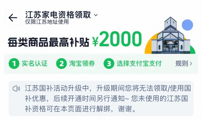淘宝“国补”专区显示,江苏国补升级中,升级期间您将无法领取/使用国补优惠,后续开通时间另行通知。