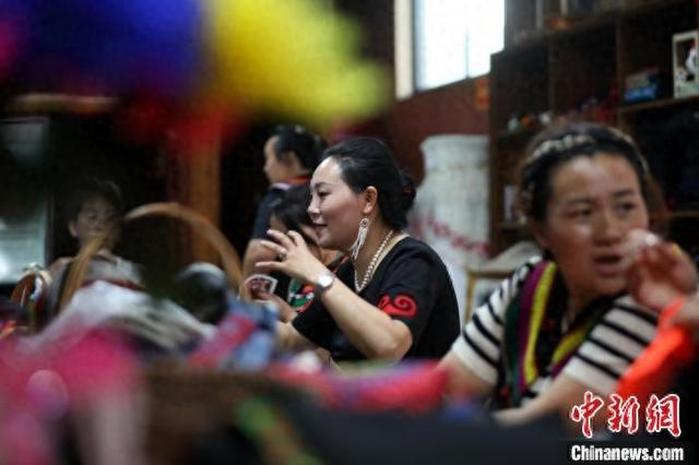 6月10日,在四川省马边彝族自治县马边花间刺绣专业合作社工作坊里,乔进双梅和绣娘们一起交流。2015年12月,四川省级非遗代表性项目彝族手工刺绣传承人乔进双梅创办马边刺绣专业合作社,构建了“1社6站15班”的网格化服务体系。10年来,累计培训绣娘超3万人次,带动800余名当地农村妇女居家灵活就业,实现“背着娃娃绣着花,养活自己养活家”。乔进双梅2020年被评为四川省民族团结进步模范个人。中新社记者 王磊 摄