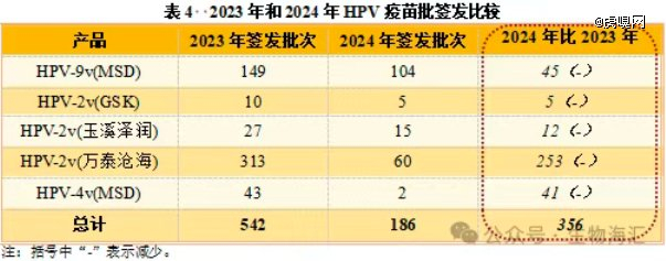 加之,随着国内低价HPV疫苗降价以及多家供应下,原本HPV疫苗一针难求局面已不见。销售端情况显示,在各地的疫苗接种中心,HPV疫苗供应充足,消费者可以随来随打。且结合生物海汇公号数据,2024年仅有默沙东一家供应的九价HPV疫苗签发批次也减少了,这意味着在供需恶化下,九价HPV疫苗也未能独善其身。