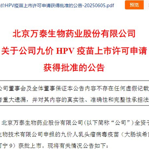6月4日盘后,万泰生物公告称,其申报的9价HPV疫苗在国内获批了,引起市场较大关注。