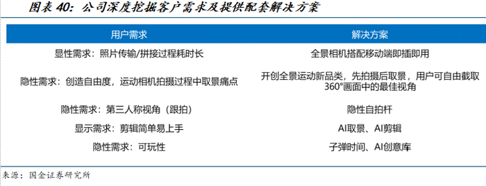 以智能影像终端产品对应的用户需求来看:显性需求包括易用性(剪辑)、基础性能(分辨率&画质、耐用性、续航),可从用户反馈的痛点进行针对提升;隐性需求包括消费者需求边界的开拓,比如隐性自拍杆、先拍摄后取景、创意玩法等等,差异化的产品定义在于真正理解“消费者真正想要的不是相机,而是能快速生成并分享到社交媒体的酷炫内容”。