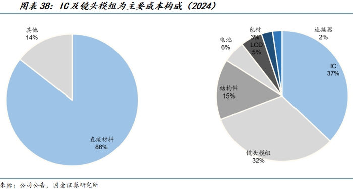 作为消费电子类产品,规模增长往往能带动采购单价的下降。公司营业成本中直接材料成本占比超80%,其中大头主要是IC、镜头模组和结构件。随着公司销量和规模的增长,部分部件和材料成本呈现出明显的降本曲线。
