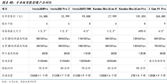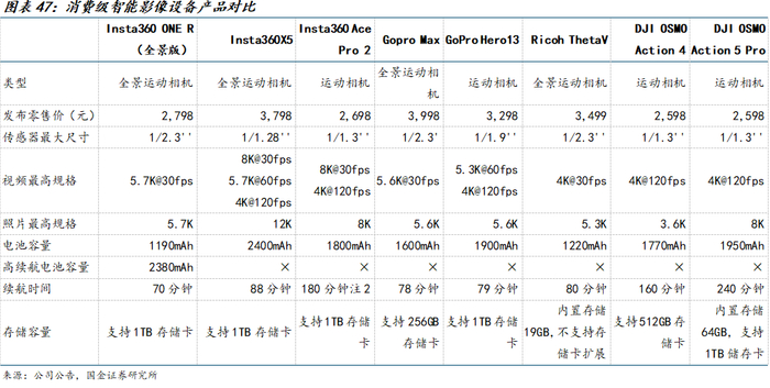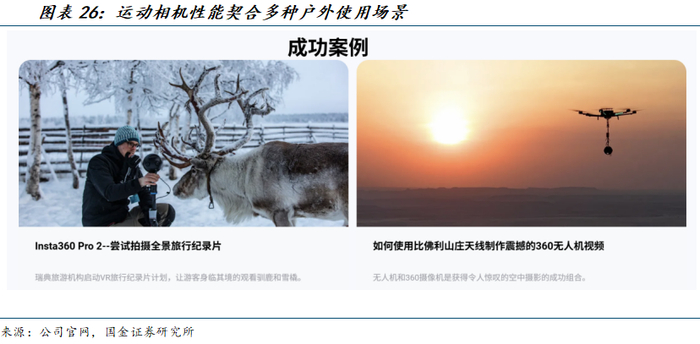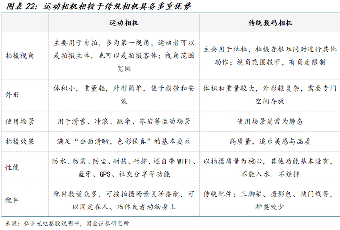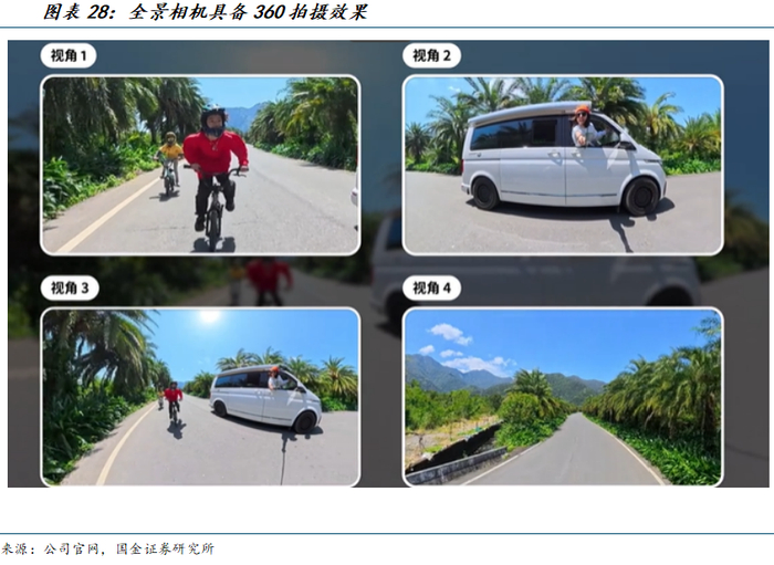 从功能角度来看,伴随着消费电子硬件突破&软件升级,影像设备作为重要的视觉记录设备,其应用场景、覆盖功能不断突破。相较于传统相机,全景&运动相机是指具备更广阔视角、计算处理能力的影像设备,综合数据处理、传感器、网络通信等等技术,通过高性能图像传感器实现对于运动影像的快速捕捉,并通过高效控制芯片、软件算法实现对于复杂图像数据的运动补正、调整、图像剪辑、图像拼接等复杂处理工作。