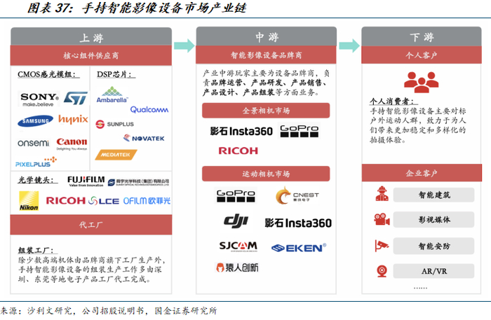 从产业链角度看,手持智能影像设备产业链上游包括芯片、镜头模组、结构件、连接器、包材和电池;产业链中游为各大智能影像设备品牌商;下游则包括个人客户和企业客户。产业链中游为各大智能影像设备品牌商,全景/运动相机厂商:公司、GoPro、日本理光、大疆创新、Garmin。
