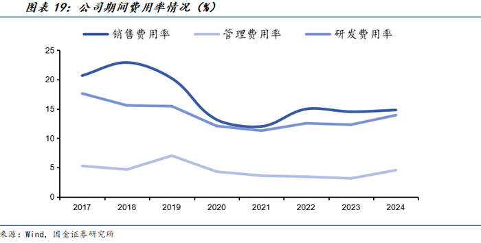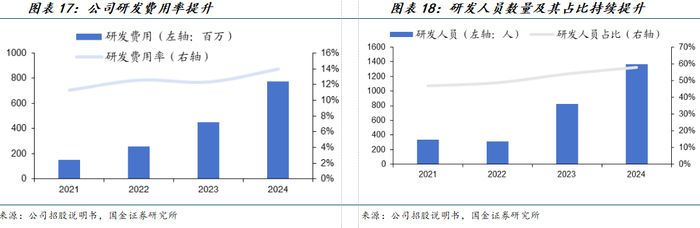 注重技术研发,研发人员占比逐年提升。公司对研发费用的投入逐年增长,产品持续迭代,从2021-2024年,公司研发支出分别为1.49亿元、2.56亿元、4.48亿元和7.77亿元,近几年的研发费用率稳步提升。截至2024年年底研发人员为1367人,研发人员占公司总人数比列为57.68%,研发人员占比有了大幅度提升。公司对销售费用加以控制且公司规模效应逐步体现,公司实行精益化管理,费用控制持续取得成效。