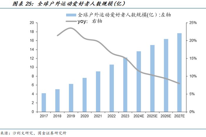 不同于追求极致画质的单反相机玩家,消费级智能影像设备玩家主要是追求运动拍摄性能的年轻户外运动爱好者。在应用领域方面,运动相机应用范围广泛,包括户外运动、极限运动、消费者日常生活、真人秀节目拍摄、赛事直播等领域。记录户外运动不同于追求极致画质的单反相机玩家,消费级智能影像设备玩家主要是追求运动拍摄性能的年轻户外运动爱好者。根据Frost & Sullivan调研,中国消费级产品核心消费人群的年龄集中在25-35岁区间,欧美集中在25-50岁区间。2023年全球户外运动爱好者人数达12.2亿,预计2027年达到17.7亿。