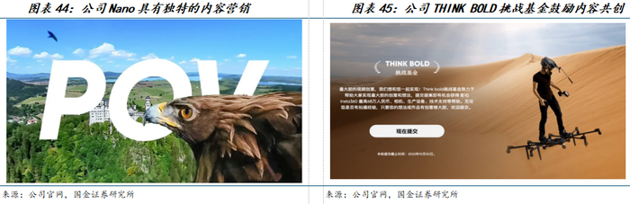 独特的内容营销模式。公司内容营销逻辑往往不是简单地介绍产品卖点和参数,而是以视频的新奇、大胆、好玩、有趣为目标,追求内容的自传播效应,吸引网友观看、好奇甚至模仿,从而实现“种草”。2017年公司推出首款消费级产品Nano时,创新性地将相机固定在老鹰背部,让观众可以清楚地看到老鹰的头部以及周围360°全景景色。