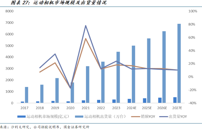 根据Frost & Sullivan的数据,全球运动相机的出货量从2017年的1,410.5万台增加至2023年的4,461万台,复合增长率达到21.2%。
