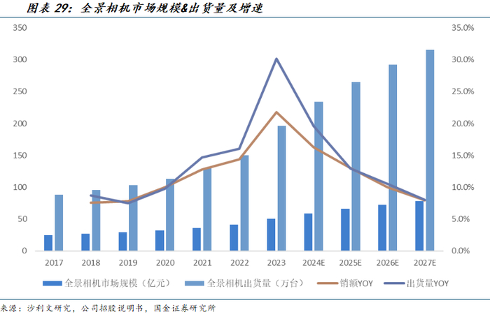 根据Frost & Sullivan的数据,2023年全球全景相机出货量为196.0万台,同比增长30.1%,市场规模为50.3亿元,同比增长21.8%;2024年全球全景相机出货量将达234.4万台,市场规模为58.5亿元,2025年出货量将达264.7万台,市场规模将增至66.1亿元。随着全景相机在户外运动、远程医疗、智慧城市等专业领域中不断渗透,未来全景相机市场规模也将进一步扩大。