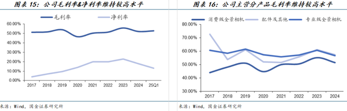 产品端,公司具备极强的产品洞察及产品定义能力,深度挖掘客户需求,软硬件配合提供领先完整的解决方案,是公司未来最核心的竞争壁垒和护城河。技术端,软硬件全景技术+AI功能+产品快速迭代,推出差异化功能,包括全景技术、防抖技术、AI影像处理技术等。渠道端,销售网络已覆盖全球一万多家零售门店和90多座海内外机场,24年线上线下销售比例分别为48%/52%,同比增长57%/51%;24年中国大陆/美国/欧洲/日韩收入占比分别为24%/23%/23%/8%,同比增长90%/43%/55%/57%/35%。