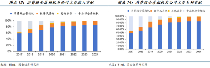 公司主营业务按产品种类可分为消费级智能影像设备、专业级智能影像设备、配件及其他产品。1)消费级智能影像设备:主要包括 ONE X 系列(全景运动相机)、ACE 系列(运动相机)、GO 系列(穿戴式运动相机)等,为公司贡献主要营收。2)专业级智能影像设备:主要包括 Pro 系列和 TITAN 系列等专业 VR 全景相机产品,近年受经济环境及市场需求影响专业级产品规模略有下降。3)配件及其他产品:主要包括适配相机的自拍杆、电池、保护壳、三脚架和蓝牙遥控器等。随着公司主机产品销量提升及产品配件品类增多,公司配件及其他产品销量逐年上涨。