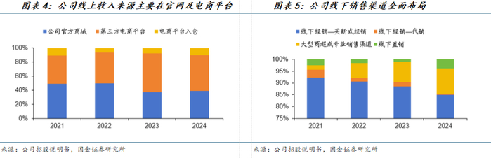 销售网络已覆盖全球一万多家零售门店和90多座海内外机场,2024年线上线下销售比例分别为48%/52%,同比增长57%/51%,历年来线下销售占比小幅提升。