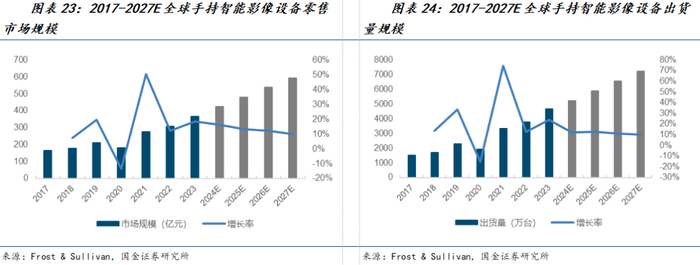 2010年,GoPro Hero HD 摄像机问世,实现用极小的机身完成1080P视频拍摄,运动相机开始受到广泛关注和规模化生产;2014年,大疆推出第一代消费级航拍无人机 Phantom 2 Vision,消费级航拍无人机逐渐形成规模;2013年,日本理光推出了第一款全景相机; 2017年开始,Insta360 影石、三星、尼康等多个品牌纷纷推出全景相机,推动全景相机市场快速发展。全球手持智能影像设备市场规模由2017年的164.3亿元增长到2023年364.7亿元,复合年增长率达到14.3%。