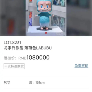 6月10日,在永乐2025春季拍卖会上,一款初代藏品级薄荷色的LABUBU最终以108万元的价格拍卖成交,买家身份未披露。拍卖直播备注栏标注,这是香港艺术家龙家升作品,尺寸为高131cm,是“全球唯一一只”。除此之外,一款全球限量15版棕色LABUBU以82万元成交。