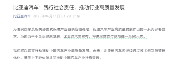 6月11日消息,今天凌晨,比亚迪汽车宣布,将供应商支付账期统一至60天内。