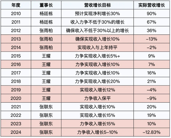 实际上,洋河股份2024年的业绩表现明显低于市场预期,这是因为公司在2023年曾制定5%-10%的年度增长战略目标,但最终未能实现。需要指出的是,这并非首次出现目标与实际业绩的偏差。洋河股份历届管理层提出的增长目标与最终达成情况之间存在落差,这一现象在过往经营中已多次出现。