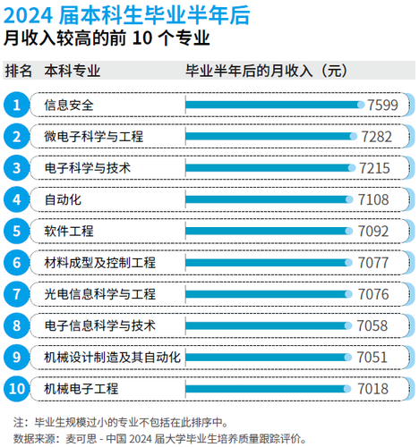 2025年的本科绿牌专业均为本科生毕业半年后平均月收入排前40位的专业。其中,2024届微电子科学与工程专业的平均月收入高达7282元,位列本科高薪专业的第2位;2024届机械电子工程专业的平均月收入为7018元,位列本科高薪专业的第10位;2024届电气工程及其自动化的工作与专业相关度、就业满意度分别为86%、85%,排在本科主要专业前列(工作与专业相关度:第15位,就业满意度:第8位)。