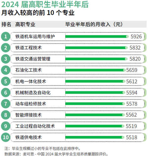 2025年的高职绿牌专业均为高职生毕业半年后平均月收入排前30位的专业。其中,2024届铁道机车运用与维护专业的平均月收入为5926元,就业满意度为85%,工作与专业相关度为84%,分别位列高职主要专业的第1、第7、第7位;2024届应用化工技术专业的平均月收入为5481元,工作与专业相关度为81%,分别位列高职主要专业的第13、第9位。