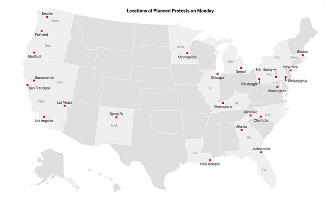 美国媒体梳理了全美多个城市的抗议活动情况。