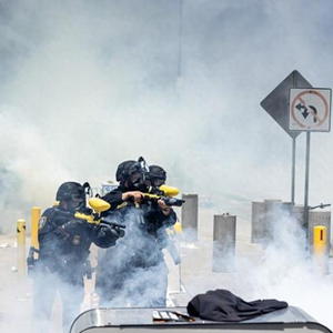 一些示威者在双方交火中四散逃开——警察发射催泪瓦斯,抗议者则燃放烟花——一群警察将一名男子推倒在地,他的头撞在混凝土路堤上。