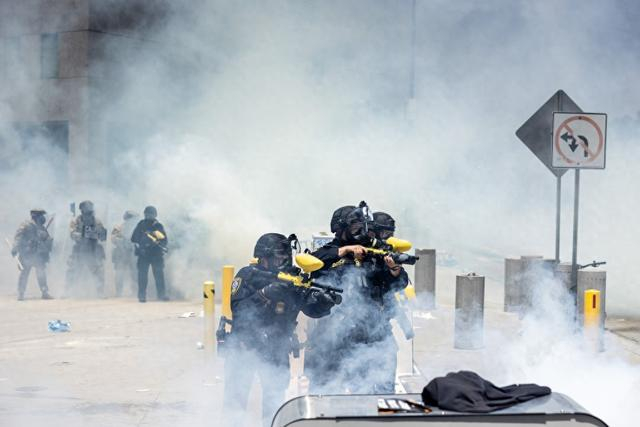 当地时间2025年6月8日,美国加利福尼亚州洛杉矶市中心,国民警卫队和国土安全部警察向示威者发射催泪瓦斯和非致命性子弹。视觉中国 图