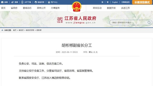 6月11日,江苏省政府官网“省政府领导”栏目更新信息显示,刚刚履新的江苏省副省长、省公安厅厅长胡彬郴,具体分工已明确: