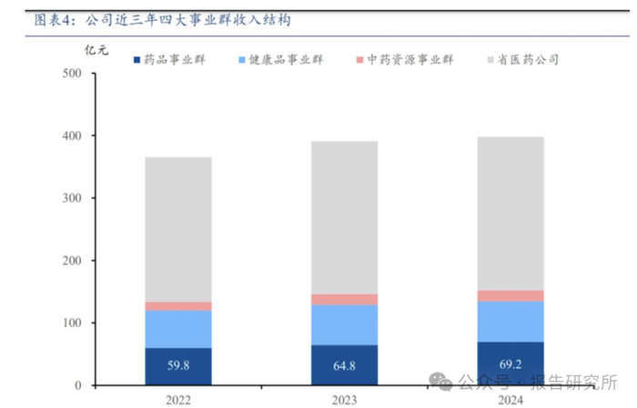 公司以药品、健康品、中药资源和云南省医药公司四大事业群为生产经营核心底座,同时快 速推进医疗器械事业部和滋补保健品事业部等新兴业务发展。 1)药品事业群以专注于止血镇痛、消肿化瘀的云南白药系列产品为主,包括云南白药气雾剂、 云南白药创可贴、云南白药散剂和云南白药胶囊等,同时还有涵盖补益气血、伤风感冒、心脑血 管、妇科和儿童等领域的天然特色品牌中药,并打造了三七植物补益类产品。 药品事业群以“伤科疼痛全领域管理第一品牌”为战略指引,深挖白药核心产品在伤科疼痛领 域的药效机制,通过“白药+痛舒+伤痛”相关产品在学术临床方面的不断开发,持续打造和提升白 药核心产品在骨伤科、疼痛管理领域的知名度和领先优势,形成大的产品生态体系。同时,药品 事业群进一步优化“品质好中药”运营平台,深入聚焦心脑血管、呼吸系统、妇儿科等高潜力赛道, 持续丰富产品管线,打造药品产业大生态,促进药品事业群长期保持稳健增长,近三年 CAGR 约 为 7.6%。