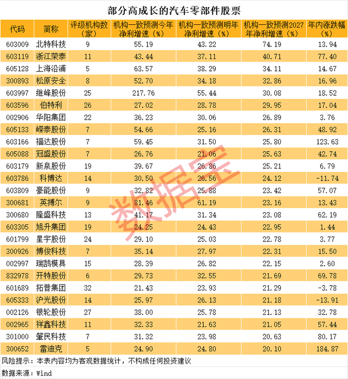 部分个股未来业绩有望高成长。5家及以上机构评级个股中,有26只个股机构一致预测今年、明年及2027年净利增速均超20%。其中,继峰股份、北特科技、浙江荣泰、上海沿浦、松原安全等个股机构一致预测三年净利增速均超30%。
