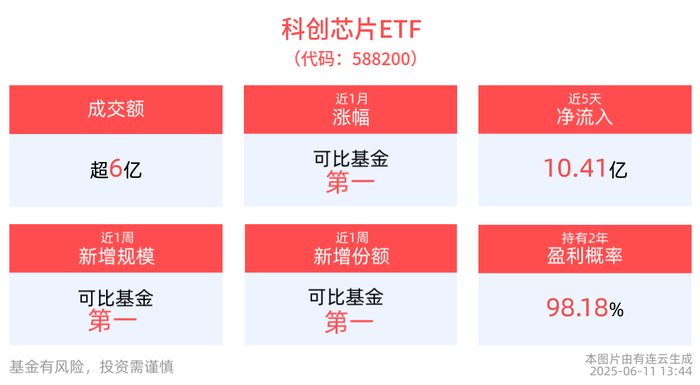 截至6月10日,科创芯片ETF近1年净值上涨61.50%,排名可比基金第一,指数股票型基金排名49/2846,居于前1.72%。从收益能力看,截至2025年6月10日,科创芯片ETF自成立以来,最高单月回报为25.18%,最长连涨月数为4个月,最长连涨涨幅为36.01%,上涨月份平均收益率为8.58%。