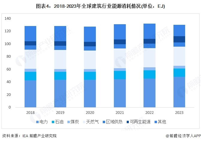 据IEA披露,2022年,全球建筑行业能源消耗量小幅增长,达到132EJ,其中仍以电力和天然气消耗为主,可再生能源的利用规模较小。2023年,全球建筑物行业能源消耗量降至130EJ。2023年,建筑行业占全球能源的32%需求,强调提高能源效率对实现可持续发展的重要性发展目标,实现《巴黎协定》设定的具体目标。2023年,全球建筑能源需求略有下降,降至每124焦耳,低约0.7%。全球冬季气温较温和,空间供暖需求减少,抵消了其他最终用途增加的需求。2023年,建筑中的化石燃料使用量大幅下降。天然气消费量下降了4%以上,延续了始于2022年的下降趋势在乌克兰战争的地缘政治影响之后。相反,电力使用仍在继续到2023年,其上升趋势将占建筑总能源需求的37%。对电力日益增长的依赖在很大程度上是驱动因素通过增加使用家用电器和空调。