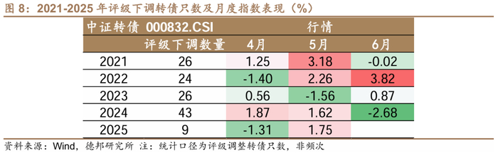 1、信用风险影响——或局部化:回顾讨论的出发点,围绕信用冲击或由近期跟踪评级报告集中披露,及24年行情经验引发。回顾2020年以来转债评级调整情况1)以年审视评级下调频次来看,除2024年以外,20年以来各个年份评级下调案例在30只以内,6月中下旬为评级调整的集中披露期。截至目前,2025年评级下调频次尚未显著高于2020-2024年同期水平,且评级下调企业多为经营存在压力的公司。2)回顾各年评级期间转债品种表现情况,除2024年6月以来,其他时间段回撤相对可控。考虑到2024年对于转债品种除了信用冲击之外,中小盘走弱、负债端高位减仓等因素亦对品种造成压制,2025年转债信用风险冲击或呈现“局部化”特点。