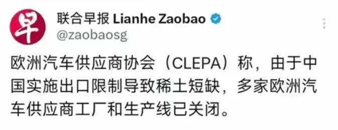 在欧洲,汽车供应商协会发出紧急预警,称由于中国对稀土元素和磁体的出口限制,欧洲汽车供应产业已受到严重冲击,多条生产线和工厂被迫关闭。