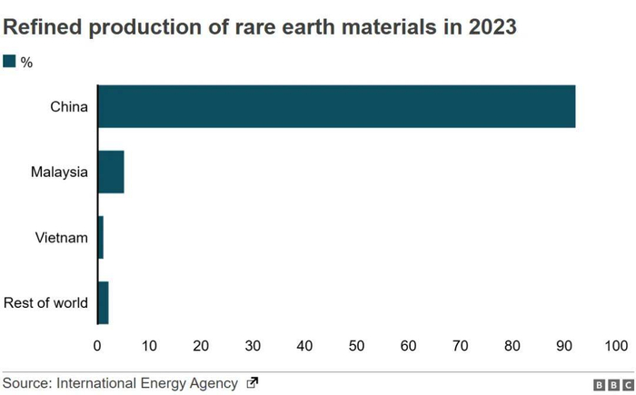 二是技术先进。中国在稀土精炼和高端磁体制造方面掌握核心科技,控制着全球超过90%的稀土精炼产能,高性能钕铁硼永磁体的生产也由中国主导,全球产量超过90%。