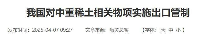 说到稀土管制,就在今年4月,中国商务部会同海关总署发布关于对钐、钆、铽、镝、镥、钪、钇等7类中重稀土相关物项实施出口管制措施的公告。