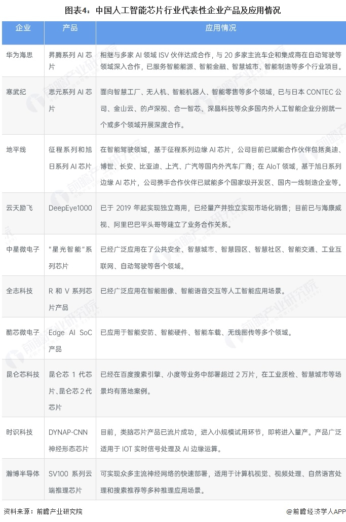 从国内市场看,中国人工智能芯片发展至今,已在芯片设计领域取得一定成就,其产品主要聚焦智能手机、智能安防、智能运载工具等应用场景。目前,国内人工智能芯片领域代表企业有华为海思、寒武纪、地平线、云天励飞、中星微电子等。
