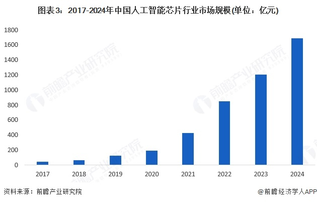 人工智能芯片是人工智能产业链的重要硬件。近年来,随着算力中心的增加以及终端应用的落地,我国人工智能芯片需求也持续提升。目前,我国人工智能芯片发展尚处于初级阶段,无论是技术研发还是应用落地都有广阔的空间。根据深圳市人工智能行业协会的统计数据,2024年,我国人工智能芯片市场规模达到1688亿元,同比增长40%。在政策鼓励、市场空间发展、技术迭代加速等作用下,中国人工智能芯片行业将快速发展。