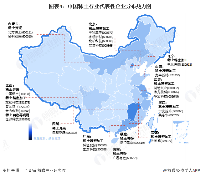 2、中国稀土产业链区域热力地图:江西、内蒙稀土矿采企业多,浙江稀有稀土金属压延加工能力强