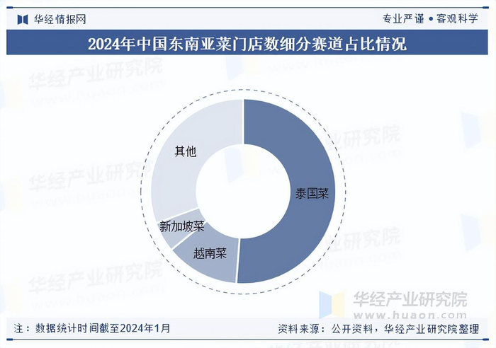 目前,东南亚菜在我国已经分化出众多细分赛道,包括泰国菜、越南菜、新加坡菜、马来西亚菜等。截至2024年1月,全国东南亚菜门店总数已超过1.5万家;其中,泰国菜凭借自身独特的口味和广泛的受众基础,门店数在东南亚菜整个赛道的占比超半数,位居行业龙头位置。越南菜、新加坡菜等也表现出强劲的发展势头,吸引了越来越多的消费者和投资者的关注。