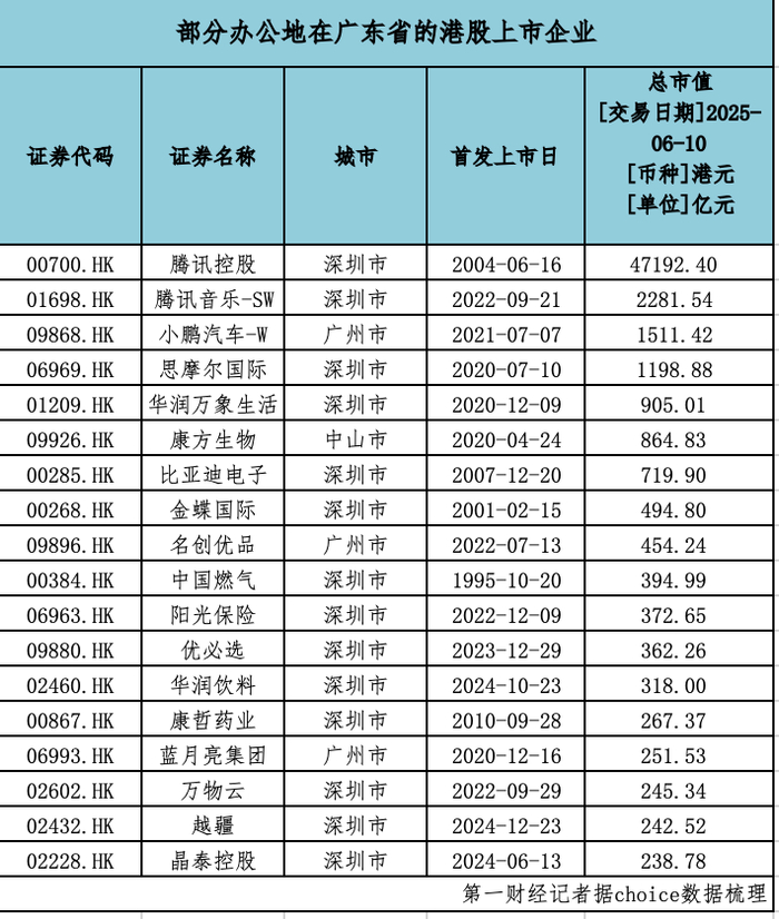在H股上市的粤港澳大湾区企业,目前为数不少。第一财经根据公开数据梳理发现,若不包含已经实现“A+H”上市的企业,目前注册地在粤港澳大湾区的港股企业,目前共有220家,另有有1712家港股企业在粤港澳大湾区办公。其中,腾讯控股(00700.HK)、友邦保险(01299.HK)、香港交易所(00388.HK)等市值超千亿的龙头企业或在列。
