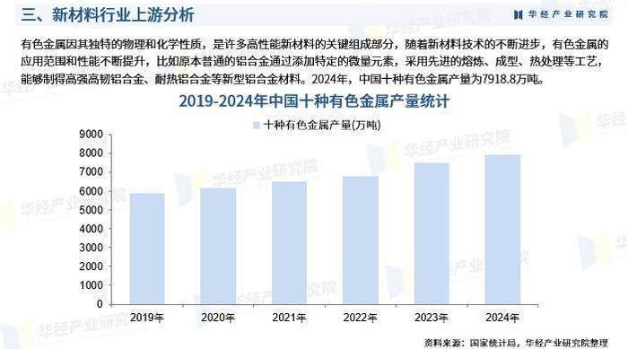 有色金属因其独特的物理和化学性质,是许多高性能新材料的关键组成部分,随着新材料技术的不断进步,有色金属的应用范围和性能不断提升,比如原本普通的铝合金通过添加特定的微量元素,采用先进的熔炼、成型、热处理等工艺,能够制得高强高韧铝合金、耐热铝合金等新型铝合金材料。2024年,中国十种有色金属产量为7918.8万吨。