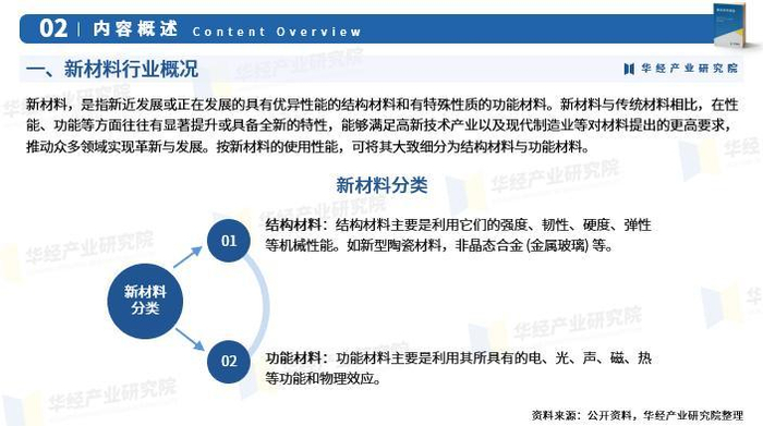 新材料,是指新近发展或正在发展的具有优异性能的结构材料和有特殊性质的功能材料。新材料与传统材料相比,在性能、功能等方面往往有显著提升或具备全新的特性,能够满足高新技术产业以及现代制造业等对材料提出的更高要求,推动众多领域实现革新与发展。按新材料的使用性能,可将其大致细分为结构材料与功能材料。