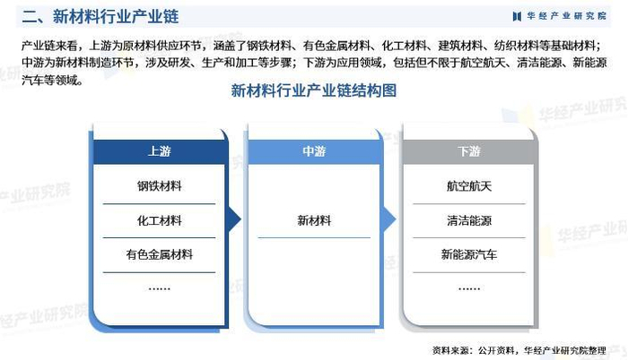 产业链来看,上游为原材料供应环节,涵盖了钢铁材料、有色金属材料、化工材料、建筑材料、纺织材料等基础材料;中游为新材料制造环节,涉及研发、生产和加工等步骤;下游为应用领域,包括但不限于航空航天、清洁能源、新能源汽车等领域。