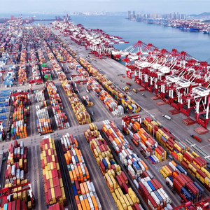 5月5日,在山东港口青岛港,货轮在装卸外贸集装箱(无人机照片)。新华社发(俞方平 摄)