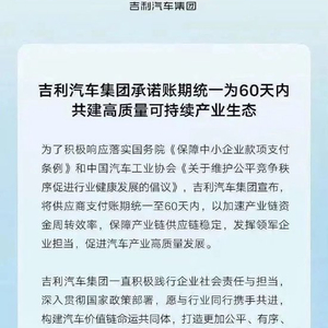 多家汽车巨头在6月10日晚集体发声,承诺供应商账期不超过60天。中国一汽明确将“60天付款”作为所属单位硬性要求,东风汽车宣布统一支付账期至60天内,广汽集团承诺保障供应链资金高效周转,赛力斯则宣称其早已执行60天账期标准。