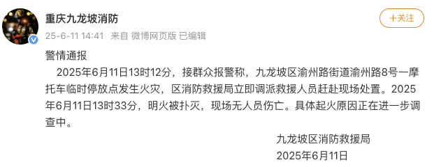6月11日,网传重庆石桥铺发生大火。有网友留言称,火灾位于石桥铺电脑城。九龙坡消防发布警情通报,6月11日13时12分,接群众报警称,九龙坡区渝州路街道渝州路8号一摩托车临时停放点发生火灾,区消防救援局立即调派救援人员赶赴现场处置。6月11日13时33分,明火被扑灭,现场无人员伤亡。具体起火原因正在进一步调查中。